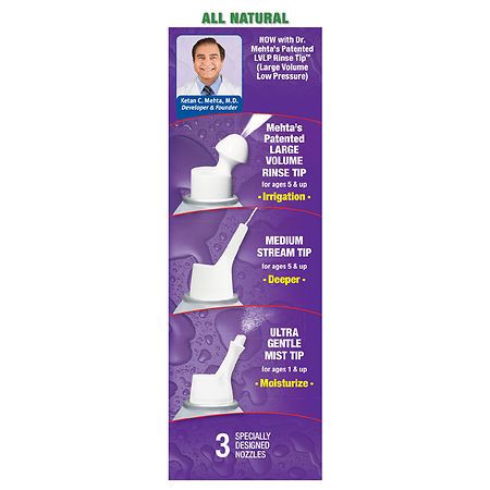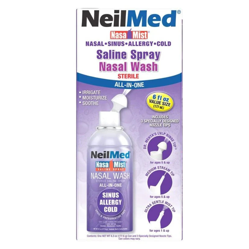 NasaMist® All-In-One es un hidratante y enjuague nasal salino Todo-en-uno. Calma, hidrata y limpia haciendo uso de tres boquillas especialmente diseñadas.